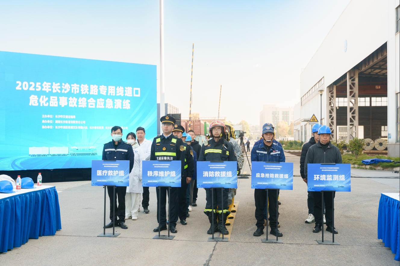 11月21日,2025年長沙市鐵路專用線道口;肥鹿示C合應(yīng)急演練在長沙新港公司舉行,演練由長沙市交通運(yùn)輸局主辦,長沙新港公司承辦,長沙市市生態(tài)環(huán)境局、開福區(qū)消防救援大隊(duì)、長沙泰和醫(yī)院參加。 演練模擬一輛裝有甲醇二甲胺的;凡酃捃嚱(jīng)過鐵路道口時(shí),因雨天路滑發(fā)生事故,導(dǎo)致裝載物泄露,一名司乘人員被困車內(nèi),一列火車即將通過道口,情況十分危急。道口值班人員發(fā)現(xiàn)事故后,第一時(shí)間通知車站信號(hào)樓,并緊急采用手旗信號(hào)截停列車,避免發(fā)生二次事故并造成更嚴(yán)重的后果,同時(shí),值班員迅速向長沙新港公司報(bào)告事故情況,包括泄漏罐車的位置、泄漏程度、是否有起火、人員受困或傷亡等信息,長沙新港公司迅速啟動(dòng)應(yīng)急預(yù)案。應(yīng)急救援、警戒疏散等多個(gè)小組攜帶裝備5分鐘內(nèi)集結(jié)完畢,奔赴事故現(xiàn)場處置。隨后,消防救援人員、醫(yī)療救護(hù)人員、環(huán)境監(jiān)測人員等各司其職,聯(lián)合處置了這一起突發(fā)事件。