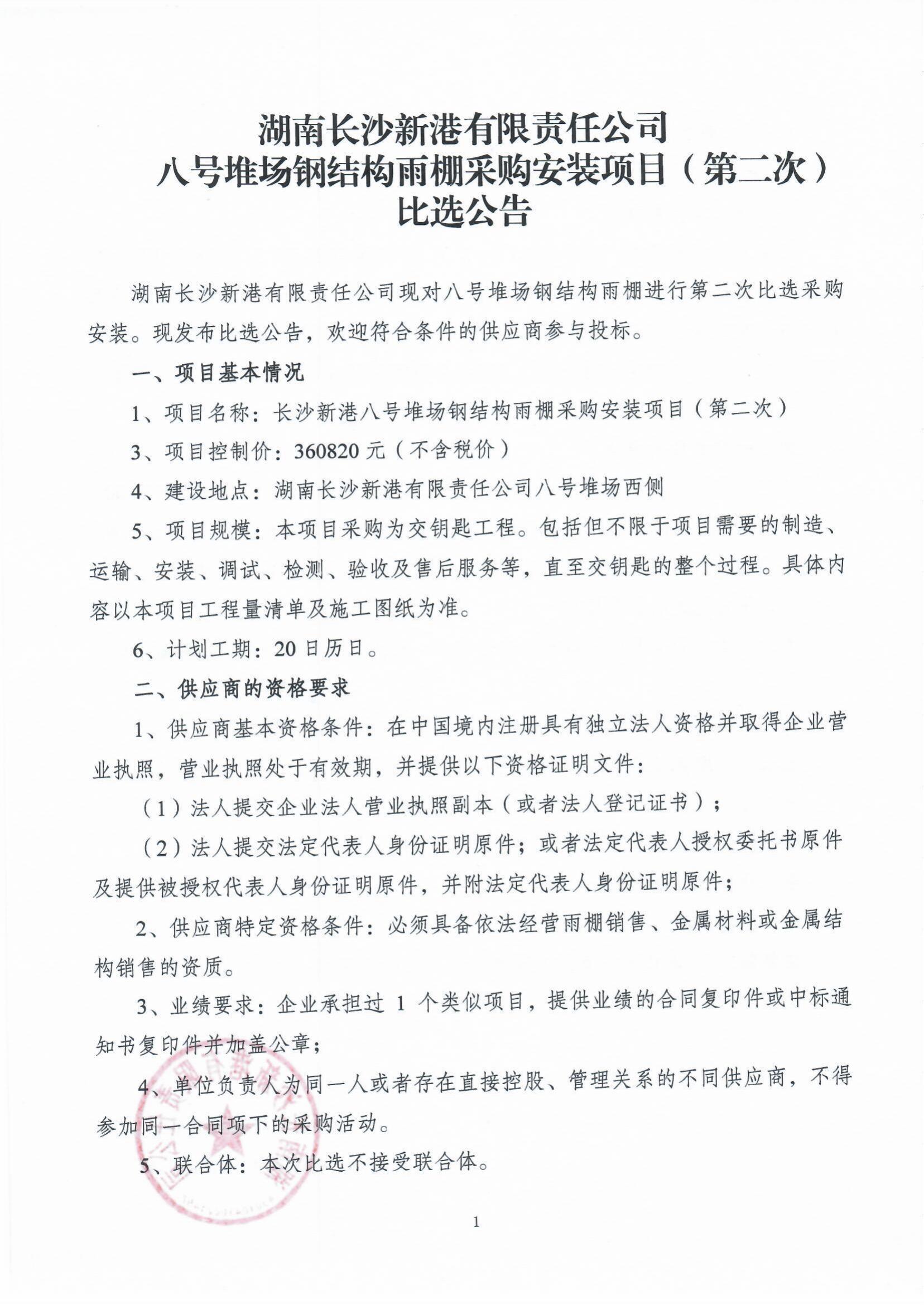 湖南長(zhǎng)沙新港有限責(zé)任公司八號(hào)堆場(chǎng)鋼結(jié)構(gòu)雨棚采購(gòu)安裝項(xiàng)目(第二次)比選公告