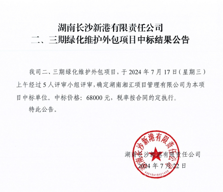湖南長沙新港有限責(zé)任公司二、三期綠化維護(hù)外包項目中標(biāo)結(jié)果公告