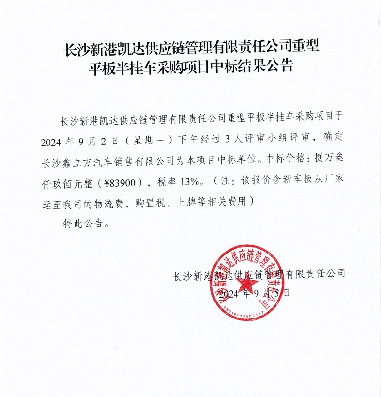 長(zhǎng)沙新港凱達(dá)供應(yīng)鏈管理有限責(zé)任公司重型平板半掛車采購(gòu)項(xiàng)目中標(biāo)結(jié)果公告